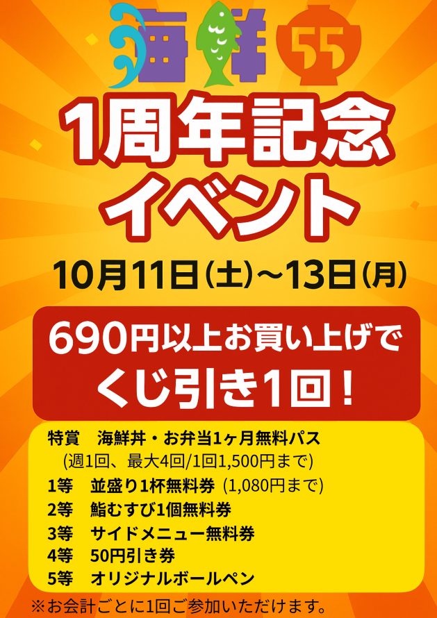🎉1周年記念くじ引きイベントのお知らせ🎉 | 総社の海鮮丼なら海鮮55 | ランチ・お持ち帰り・テイクアウト